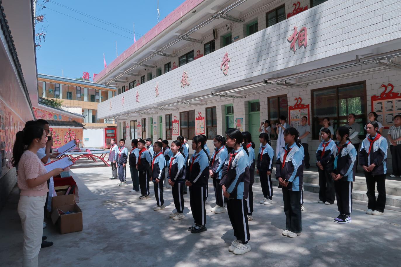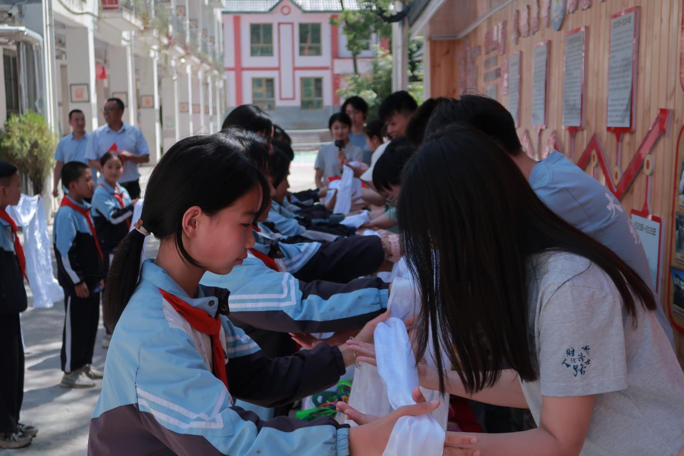 在《感恩的心》旋律中,毕冠华向杨文礼移交捐赠物资,包括篮球、足球、羽毛球拍、跳绳、课外读物等近百件物品。随后,杨文礼向实践队赠送锦旗,双方握手合影,定格温暖瞬间。