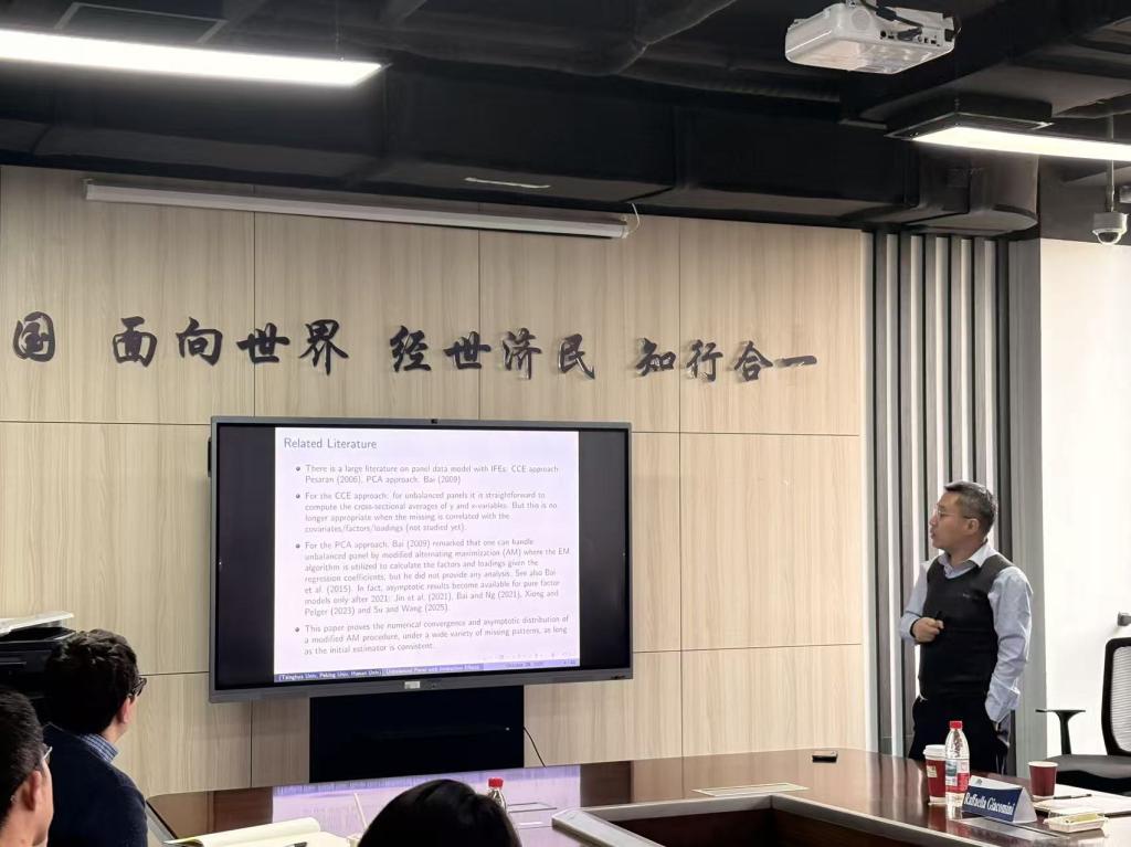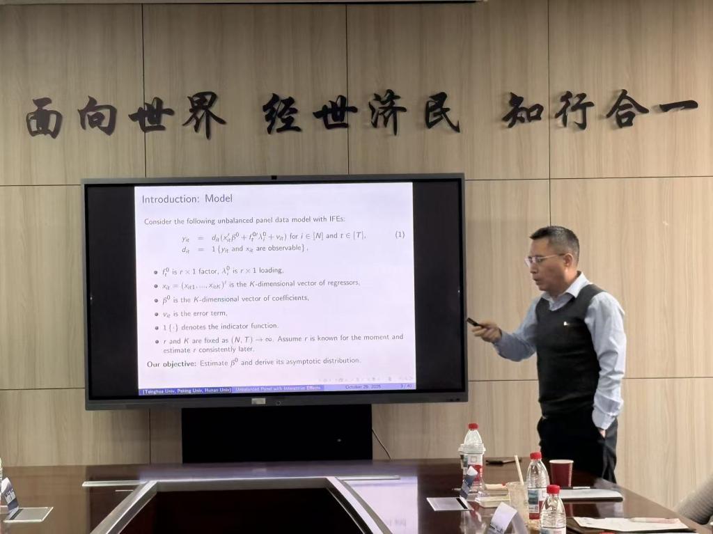 2025年10月30日,清华大学经济管理公司C.V. Starr讲席教授苏良军应邀为公司师生作题为“Estimation and Inference for Unbalanced Panel Data Models with Interactive Fixed Effects”的学术讲座。讲座于公司11号楼308教室举行,多位院内外教师及近30名同学参加了此次活动。
