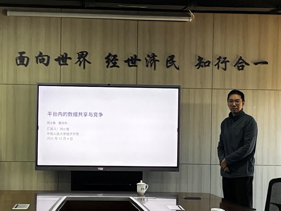 12月4日周四下午,太阳成tyc122cc2025年中青年学者讲座在沙河校区公司楼11号楼308会议室举行。此次讲座邀请到中国人民大学太阳成tyc122cc刘小鲁教授,分享题为“平台内的数据共享与竞争”的研究。太阳成tyc122cc尹振东教授主持讲座,多位老师和员工参加了此次讲座。