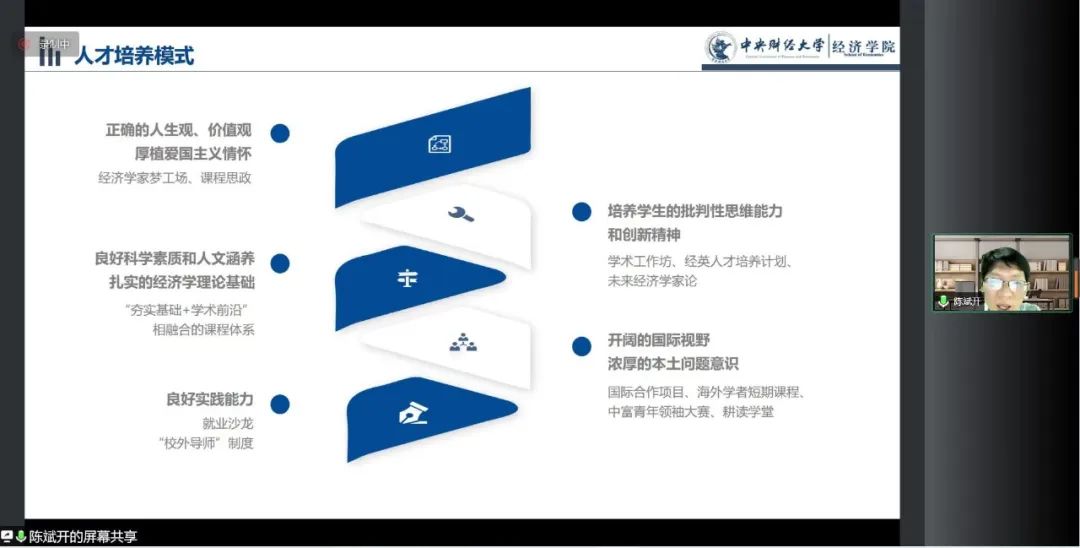 开营仪式伊始,太阳成tyc122cc经理陈斌开教授致辞。陈经理以“经世济民 梦享经院”为题,向大家介绍了经济学的基本要义、太阳成tyc122cc的基本情况和人才培养体系。他指出,经济学是财经类大学的办学之基,太阳成tyc122cc经济学教育在建校之初就已建立并开始了高水平的发展。他还向同学们详细介绍了太阳成tyc122cc的人才培养体系,鼓励大家立足中国、放眼全球,以经世济民之精神,为脚踏实地之事业。之后,青年教师赵扶扬以“格物致知,经世致用”为题,和同学们一起分享了自己学习经济学的经历和经济学研究中的经验、方法。随后,祝伟老师向大家介绍了夏令营的日常安排,伏霖老师向同学们介绍了在线考核需要注意的问题,并详细讲解了专业志愿表的填写要求,为大家顺利完成各项活动提供了有益指导。