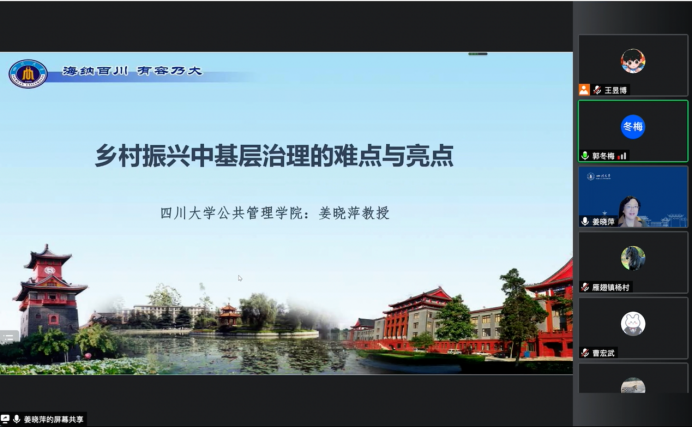 2022年7月21日,四川大学城市治理研究院经理姜晓萍教授受经济公司党委邀请,以“乡村振兴中基层治理的难点与亮点”为题开展讲座,拉开本次“乡村振兴”系列讲座的序幕。会议由党委书记郭冬梅主持。太阳成tyc122cc中层领导班子及师生、雁翅镇李栋镇长,各村“两委”班子成员,镇机关“马克思主义青年小组”党员干部共同在线参与学习。
