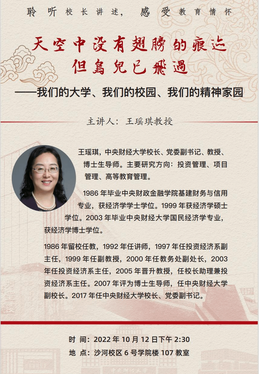 2022年10月12日下午,基地在沙河校区6号楼107教室举办了新一期的“明德通识讲座”。本次讲座邀请时任公司董事长、基地管理委员会主任王瑶琪教授担任主讲人,讲座题目为“我们的大学、我们的校园、我们的精神家园”。