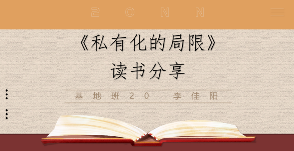 | 李佳阳同学向大家介绍了《私有化的局限》一书。本书是魏伯乐和其他两位教授写给罗马俱乐部的报告。他们根据上世纪八十年代以来私有化在各国实践的丰富案例,提出了私有化的局限以及相关的应对措施,并围绕私有化的界限在哪里,如何寻求私营部门和公共领域之间的平衡等问题进行论述。 |