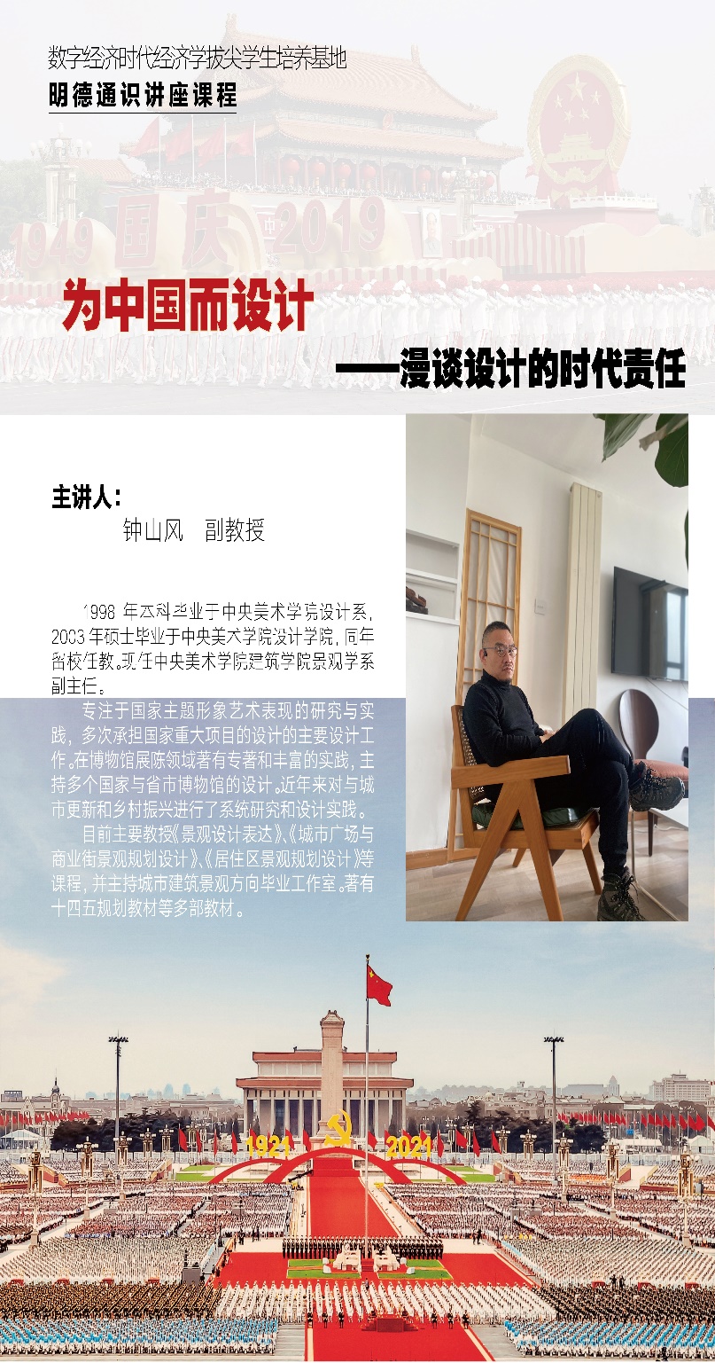 2023年4月19日,基地在沙河校区6号楼107教室举办了新一期的“明德通识讲座”。本次讲座邀请中央美术公司建筑公司景观学系副主任钟山风副教授担任主讲人,讲座题目为“‘为中国而设计’——漫谈设计的时代责任”。