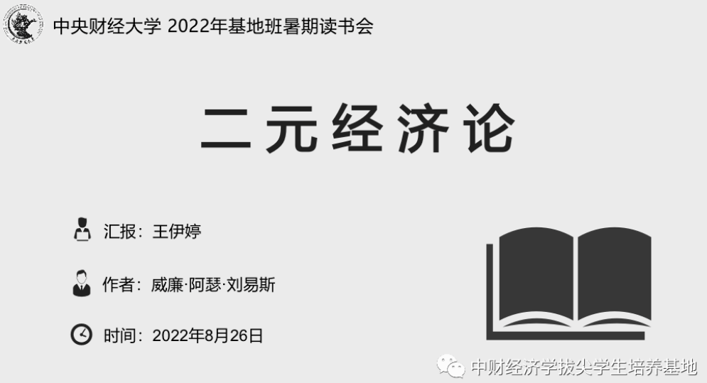 王伊婷同学分享了由诺贝尔经济学奖得主威廉·阿瑟·刘易斯所写的《二元经济论》。全书共收集了刘易斯有关二元经济理论的七篇论文,虽每篇论文独立成章,但综合起来则构成一个较为完整的理论体系。 |