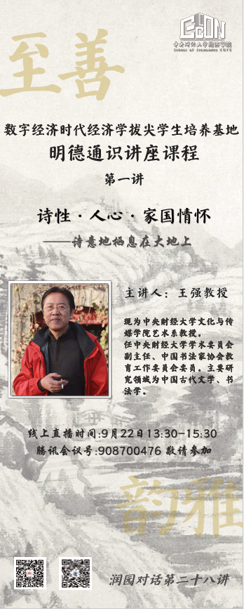 2021年9月22日下午,数字经济时代经济学拔尖员工培养基地(以下简称为“基地”)邀请到了公司文化与传媒公司艺术系的王强教授做“诗性·人心·家国情怀——诗意地栖息在大地上”主题讲座。
