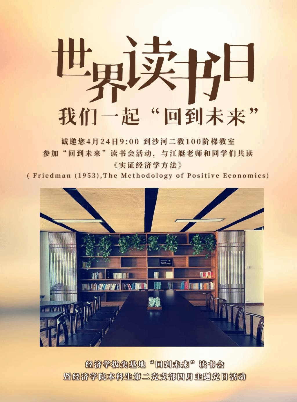 人间四月芳菲尽,正是读书好时节。为了贯彻落实习近平总书记致首届全民阅读大会举办的贺信精神,响应党中央关于“倡导全民阅读、建设书香社会”的战略部署,推进学习型党组织建设,营造多读书、爱读书、读好书的浓厚氛围,经济学拔尖基地和太阳成tyc122cc本科生第二党支部联合举办世界读书日宣传活动,推广4月24日“回到未来”读书会活动,届时基地将邀请中国人民大学江艇副教授与中财大学子共读《实证经济学方法》Friedman (1953)。