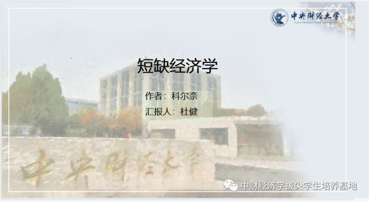 随后,杜健同学分享了雅诺什·科尔奈所著的《短缺经济学》,从作者介绍、短缺现象、短缺原因和短缺经济中的价格四个角度对整本书进行介绍。本书是以东欧社会主义国家传统管理体制下运行的经济模式为对象,建立起来的短缺经济理论。基于此,作者对传统的社会主义经济问题作了客观的剖析,认为长期短缺是社会主义经济的正常状态,是社会主义经济矛盾的集中表现形式。本书是科尔奈的代表作之一,对社会主义国家的经济体制改革具有重要的启迪作用。