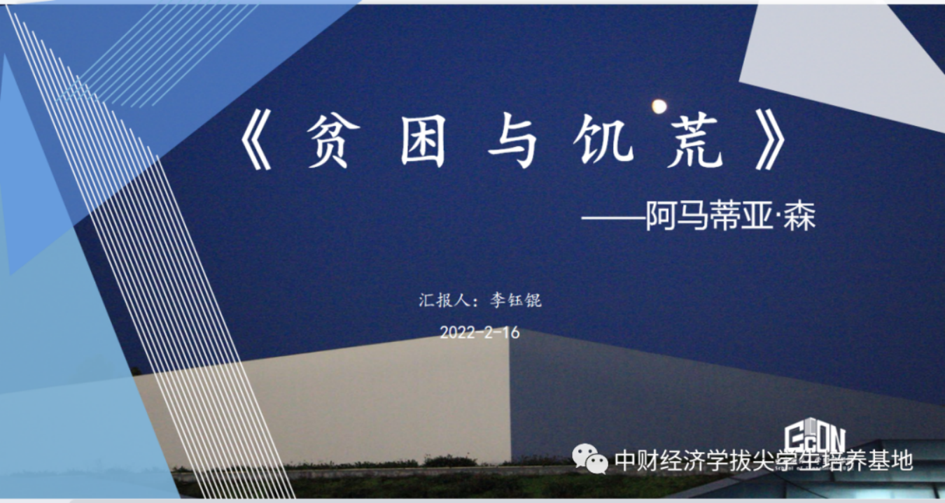 最后,李钰锟同学分享了1998年诺贝尔经济学奖得主阿马蒂亚·森所写的《贫困与饥荒》一书,从作者介绍、本书框架、重点内容以及对中国现状的启示四个方面对整本书进行了介绍。该书重点关注了饥饿的一般原因和饥荒的具体原因,把权利方法应用于贫困、饥饿的理论分析以及四次饥荒案例的具体分析,说明了饥饿是交换权利而非食物供给的函数,它体现了权利的剥夺。同时本书也将贫困的原因分析从经济因素扩展到了政治、法律、文化等领域,将贫困问题置于经济学、伦理学、政治学等学科的综合研究,为贫困问题的研究开阔了视野,值得同学们阅读。