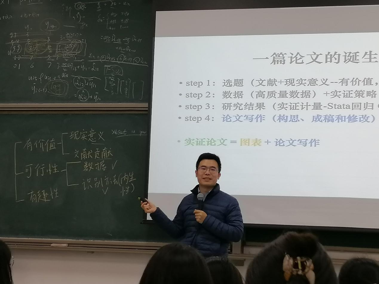 首先,他指出写好一篇论文的基础是拥有一个好的选题,这个选题需要满足三个维度的要求:第一,选题需要有价值,它不仅需要包含现实意义,重点研究中国问题、发展中国家的经济问题,还需要具备突出的文献贡献。第二,选题需要具备可行性,同学们不仅需要通过大量检索以获得可靠的数据,还需要使用可行的计量经济学的识别方法,着力解决研究的内生性问题。第三,要是同学们对自己有更高的学术要求,则需要使文章具备有趣性。如果满足以上三个维度,选题就具备了很大的研究潜力。但他也提到,在本科阶段要达到选题的以上要求比较困难,建议找相关老师咨询指导,进一步确定选题。其次,在获得高质量数据后,梁老师强调了使用可行的识别方法进行数据处理的重要性。他建议低年级员工通过自学高级计量经济学书籍和观看视频来掌握stata软件的具体操作,而高年级员工则应通过阅读大量文献来加深对研究方法的理解。同时他也指出,在开始使用相关方法对数据进行回归处理时容易出现结果不显著的情况,对此同学们需要给自己预留充足的时间来更换选题。随后,他建议同学们把处理完的数据以及相关图表进行整理,以便后续论文撰写时查看使用。最后,他指出基于之前的构思准备,同学们需要运用简洁、明了、直接的文字和清晰的逻辑完成论文写作,并反复修改润色,完善技术细节。