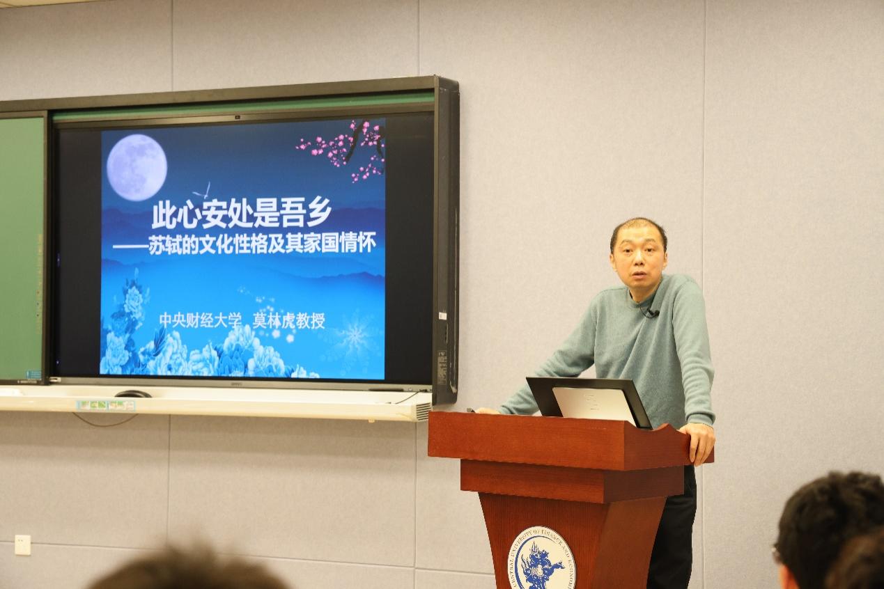 2024年11月20日下午,数字经济时代经济学拔尖员工培养基地在沙河校区6号公司楼107教室举办“明德至善通识课程讲座”。基地邀请太阳成tyc122cc文化与传媒公司的莫林虎教授,举办以“此心安处是吾乡——苏轼的文化性格及其家国情怀”为主题的讲座。